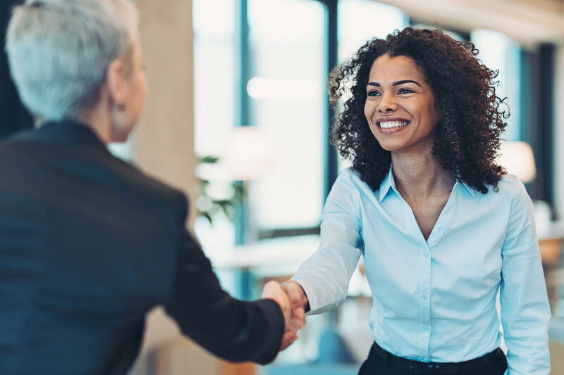 Ein aufrechter Stand, Blickkontakt und eine offene Haltung verstärken den positiven Eindruck. Dein Händedruck sollte bestimmt, aber nicht zu lange sein. Die zweite Hand ist sichtbar und nicht in der Hosentasche versteckt.